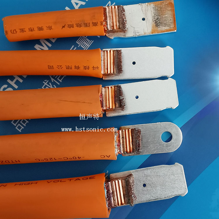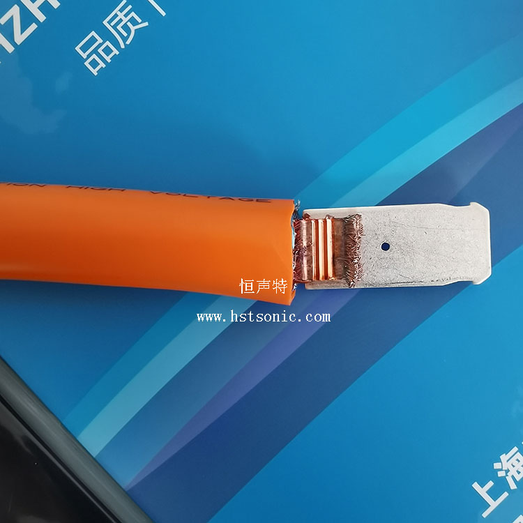 50平方線材與銅端子超聲波點(diǎn)焊機(jī)焊接壓合搭接焊接,電阻幾乎為零,焊點(diǎn)牢固。